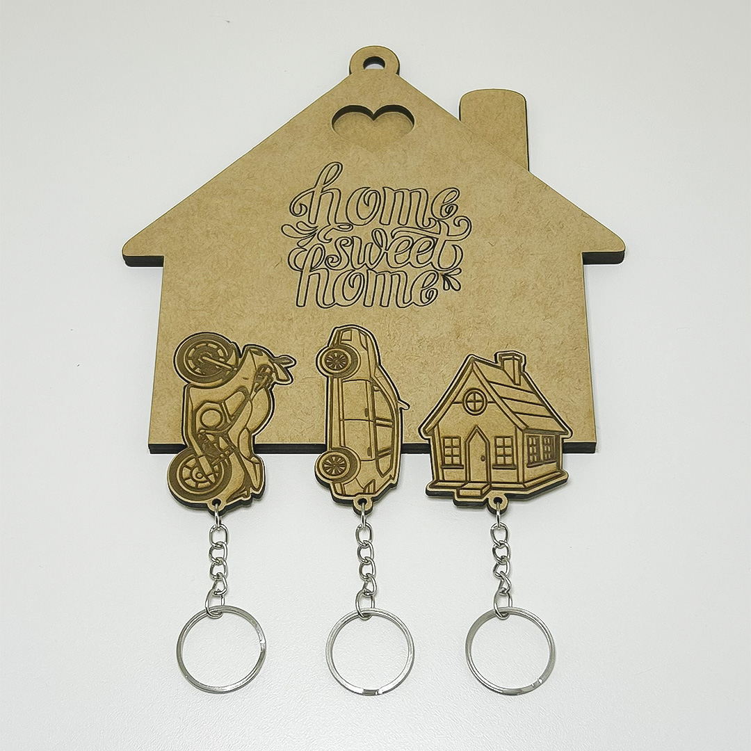 Com design em formato de casa e gravação “Home Sweet Home”, ele conta com chaveiros personalizados que representam diferentes estilos (como casa, carro e moto), tornando o produto ideal para famílias ou para presentear alguém especial.